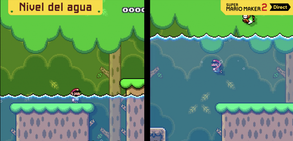 NIVEL DE AGUA: Anteriormente los niveles en Super Mario Maker 1 en este ambiente eran totalmente acuáticos, sin embargo ahora será posible integrar en diferentes ecosistemas el elemento de agua que subirá y disminuirá su nivel con tres velocidades diferentes de acuerdo a la configuración del creador del nivel. Este elemento también marcará una nueva forma para jugar Super Mario Maker 2
