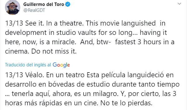 En términos generales, Guillermo Del Toro invitó a mirar la cinta en un cine por aquello de que también estará disponible a través de Netflix.