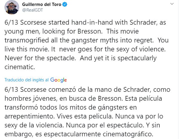 El director mexicano y ganador del Oscar, Guillermo del Toro, reseñó el nuevo largometraje de Martin Scorsese, The Irishman.