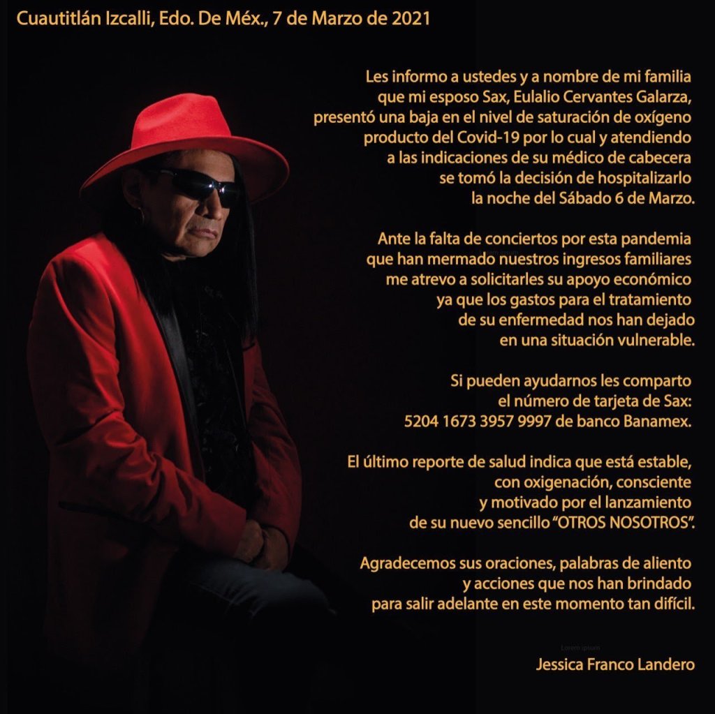 Lo anterior lo dio a conocer la esposa de Eulalio Cervantes, mejor conocido por Sax, Jessica Franco, quien pide ayuda para costear el tratamiento de Sax contra el COVID-19.