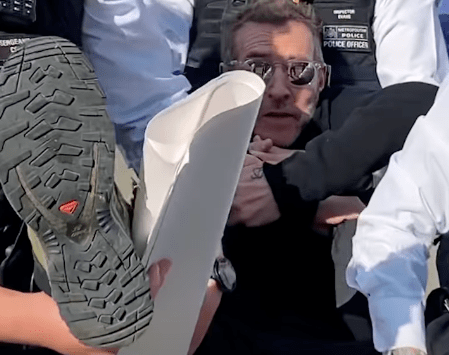 A través de las redes sociales se difundió el video donde se ve a Del Naja cuando fue llevado cargando al ser acusado por la policía de participar en un acto de terrorismo.